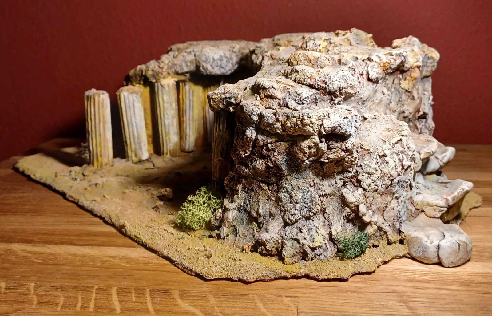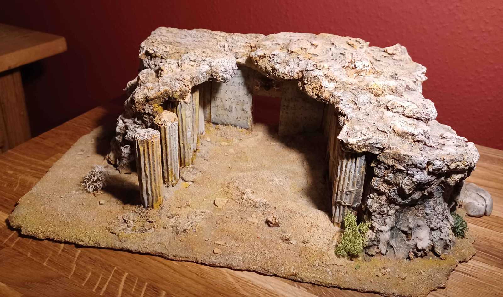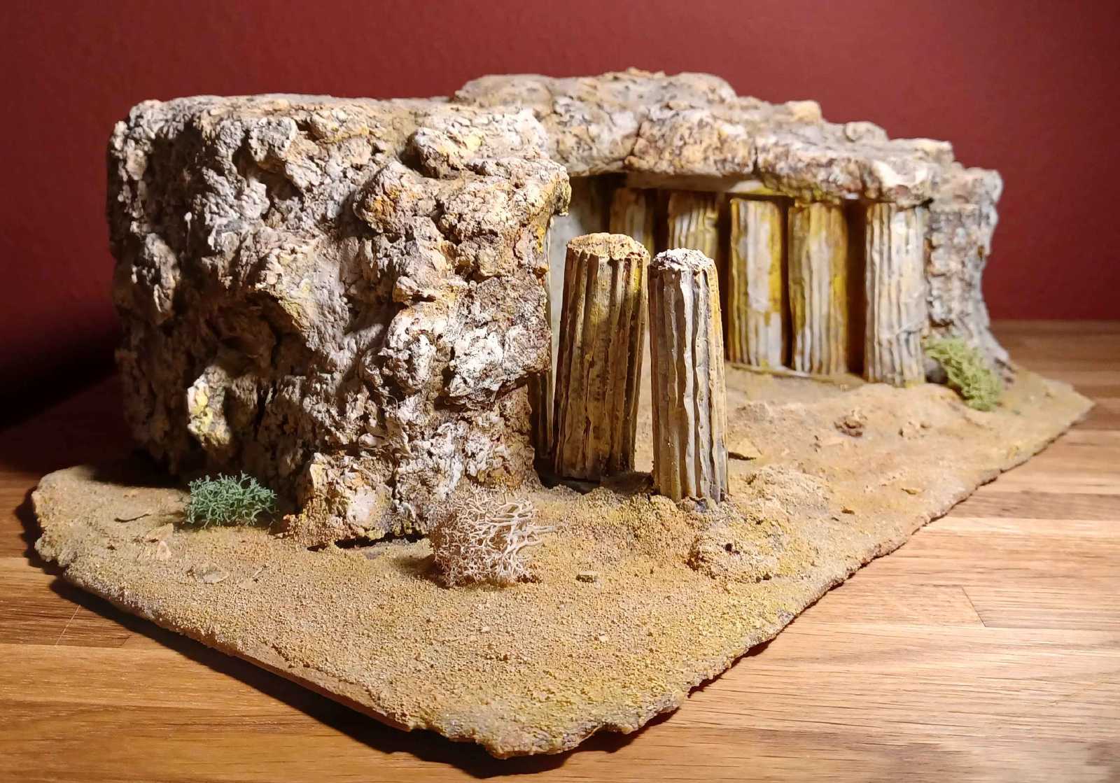 Außer Polystyrol zum groben Ausformen habe ich Pappmaché, Gips und Holzleim benutzt, um die Felsobferfläche zu gestalten. Die Säulen sind aus Wellpappe gemacht, die in Kekspackungen zu finden ist. Wenn man einen Dübel oder eine andere Art Zylinder verwendet, werden sie alle gleich groß, und mit Gips gefüllt werden sie auch etwas robuster. Die Keilschriftreliefs wurden mit einem Skalpell aus Pappe geschnitzt (ich habe keine Ahnung was dort steht, Akkadisch zu lernen war mir zu viel des Guten) und die Skarabäusdekoration stammt von einer Mumienminiatur, die ich längst für andere Zwecke verwendet habe. Nachträglich habe ich noch die kleine Treppe aus Epoxidknetmasse hinzugefügt, weil ich wollte, dass das »Dach« ohne weiteres erreichbar ist.