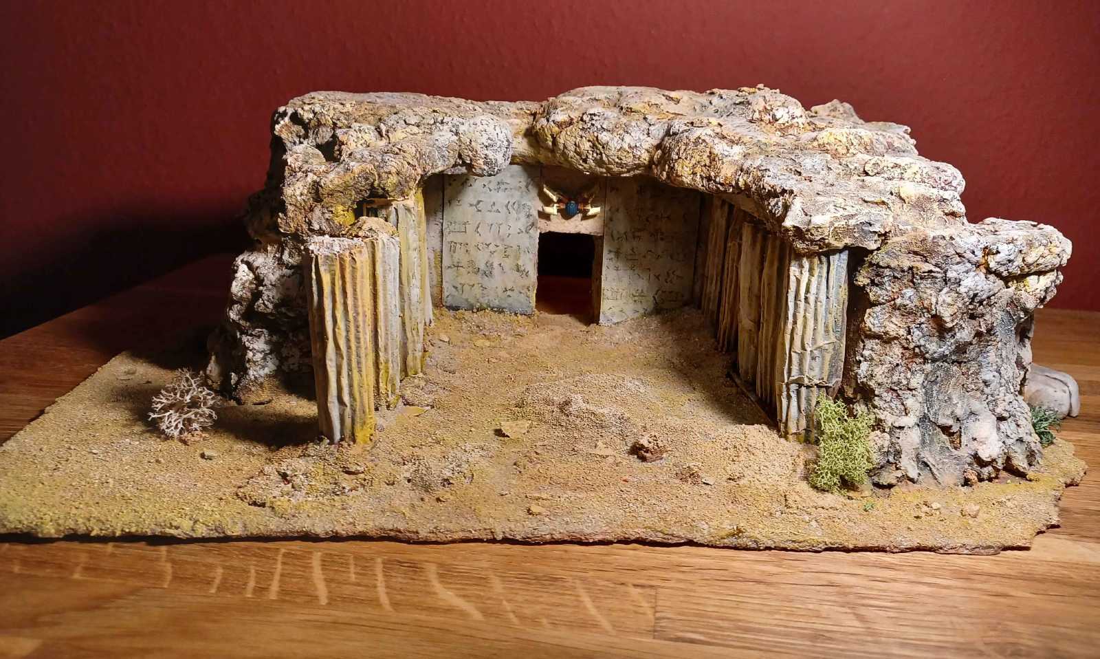 Die Atmosphäre des zweiten Akts in Diablo 2 hat mich immer besonders fasziniert. Seitdem habe ich mit Sicherheit Monate meines Lebens damit verbracht, der Hintergrundmusik von Lut Gholein und den vielen anderen großartigen Titeln zu lauschen, und freue mich auf mehr. Ich bin überzeugt, dass Diablo 2 ursprünglich mein Interesse an Ägypten und den antiken Zivilisationen im Zweistromland geweckt hat. Es war also nur eine Frage der Zeit, bis ich mir etwas aus diesem Spiel für mein Miniaturgelände nachbauen würde: In der Wüste muss der Spieler die wahre Gruft des Magiers Tal Rasha finden, die zwischen vielen falschen Grüften, allesamt in den Fels gegraben, versteckt ist. Eine dieser Grüfte sollte also in Zukunft meine Tischplatte zieren.